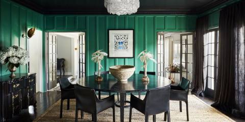Looking at your home from a holistic perspective—seeing how each room works in balance against the others—can help craft a welcome variety in your spaces, like this emerald and charcoal dining room that adds a touch of formality to an otherwise contemporary Los Angeles home.